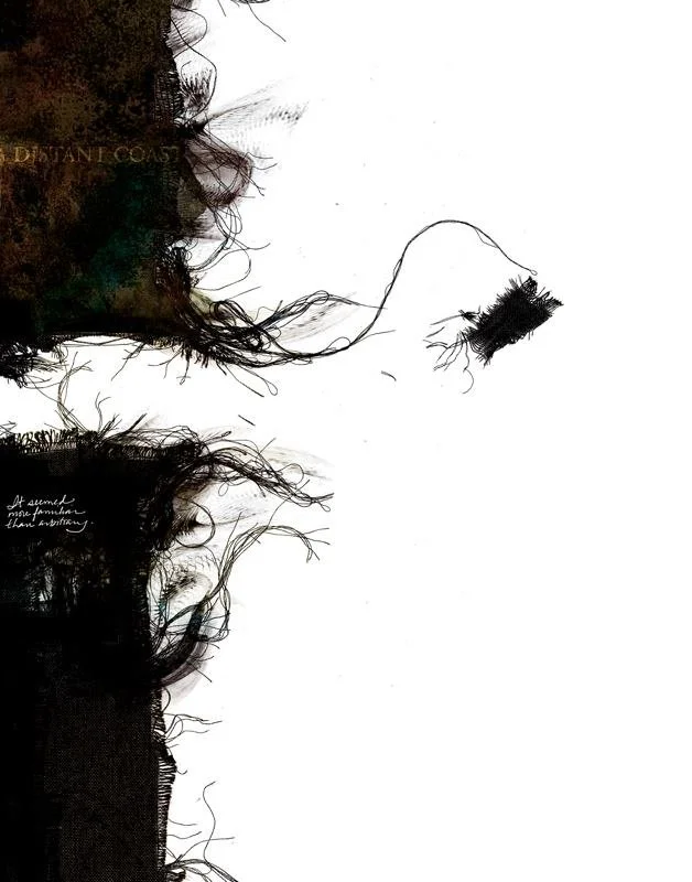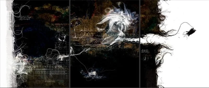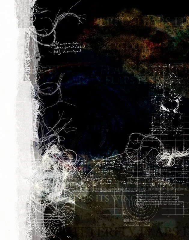 This piece also uses high-contrast figure/ground relationship to add to this idea. On the left side the thoughts are white and the background is black. But sometimes a realization is so powerful that it actually tears into our context—the ground that we thought we were working in. When that happens (right side), our perspective reverses itself and our focus becomes the (black) fibrous strings that were the background – and suddenly the background has become a whole new layer the white color of the thoughts that were once our focus.