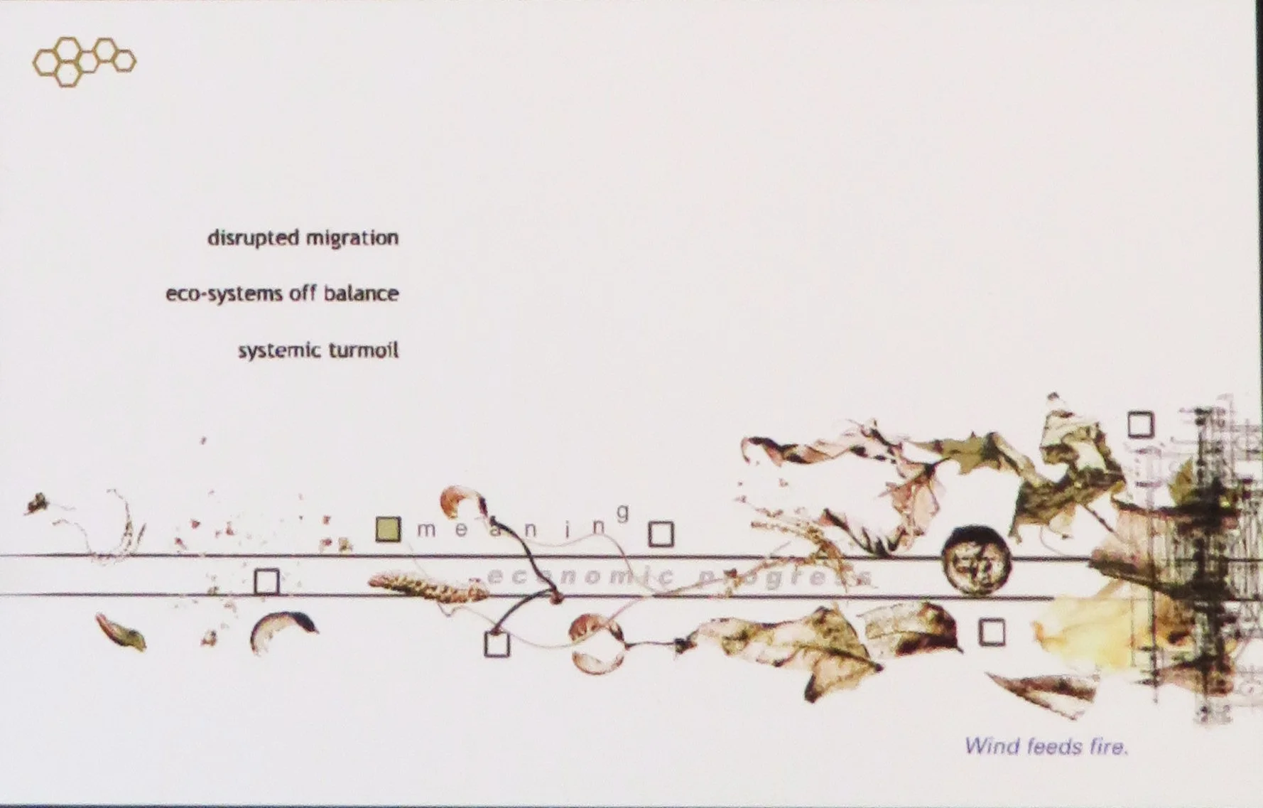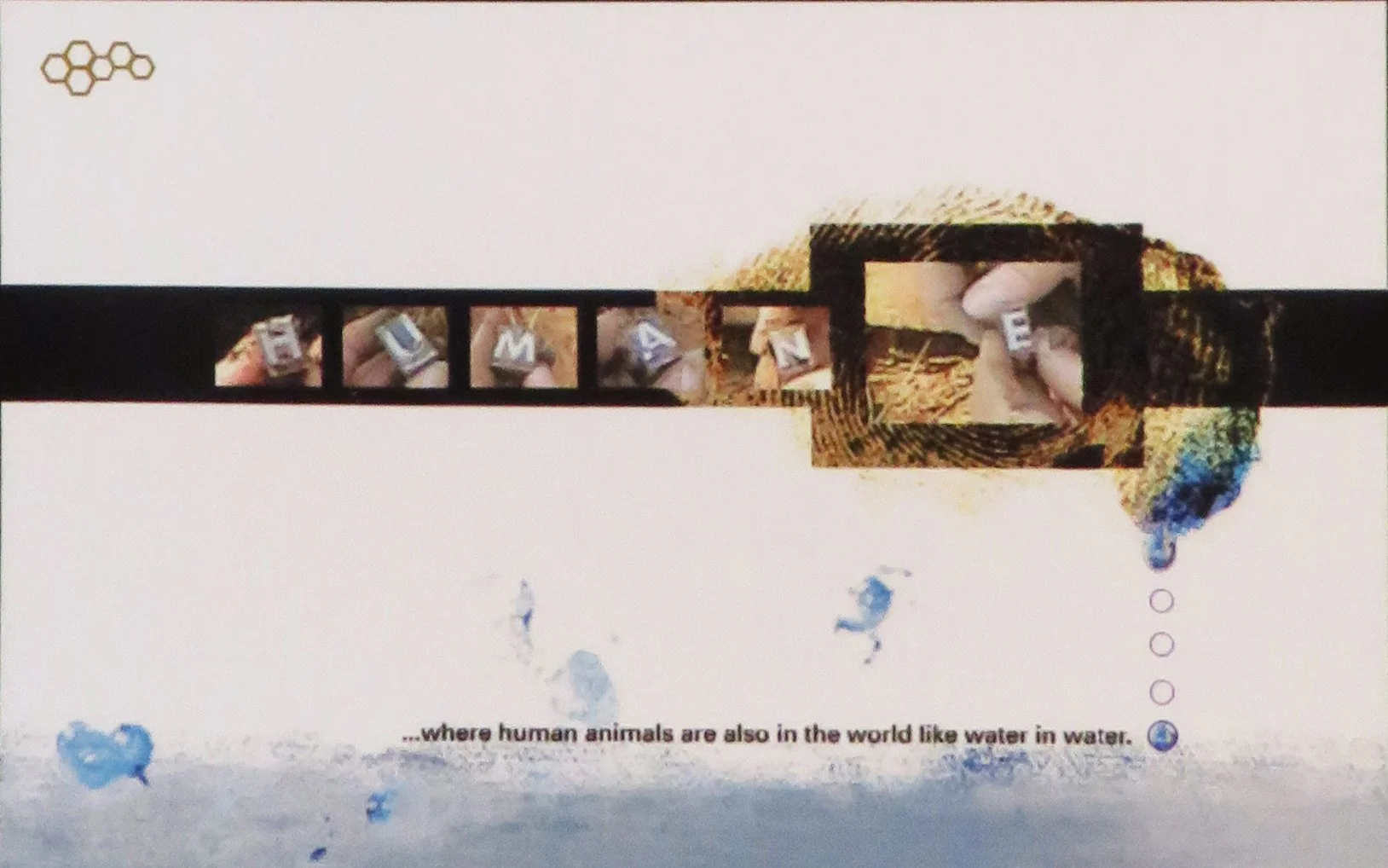 The images presented here are stills, without their animation or interactivity. I hope they nevertheless carry some of the meaning my work intended to convey. One page shows six small videos of my hands digging in the earth, the first five discovering letterpress letters: H, U, M, A, N. The sixth box just shows continual digging (for the E). One page shows the wind that trails “economic progress” with buttons that reveal haiku poems (usually about nature’s beauty), about the consequences of economic progress. One page deals with control over animals, one page is about the system of marketing and commercialization, and one page is about our individual responsibility to find ways to be part of the solution.